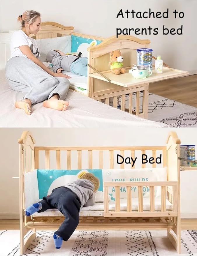 - 👶 Built-In Diaper Changing Station – Convenient multipurpose tray for quick diaper changes and easy access to baby essentials. 🛏 Parent Bed Attachment – Sleep close to your baby for night feeds without compromising safety.